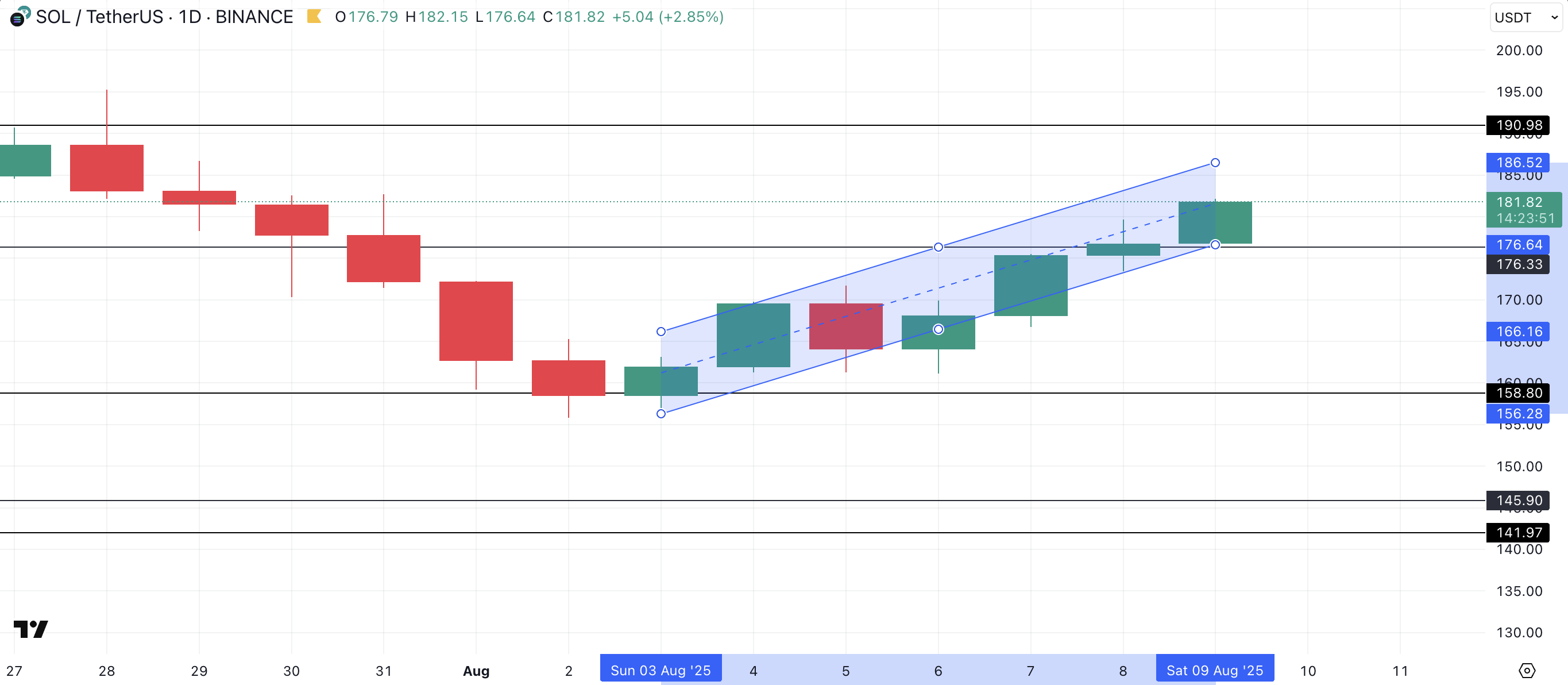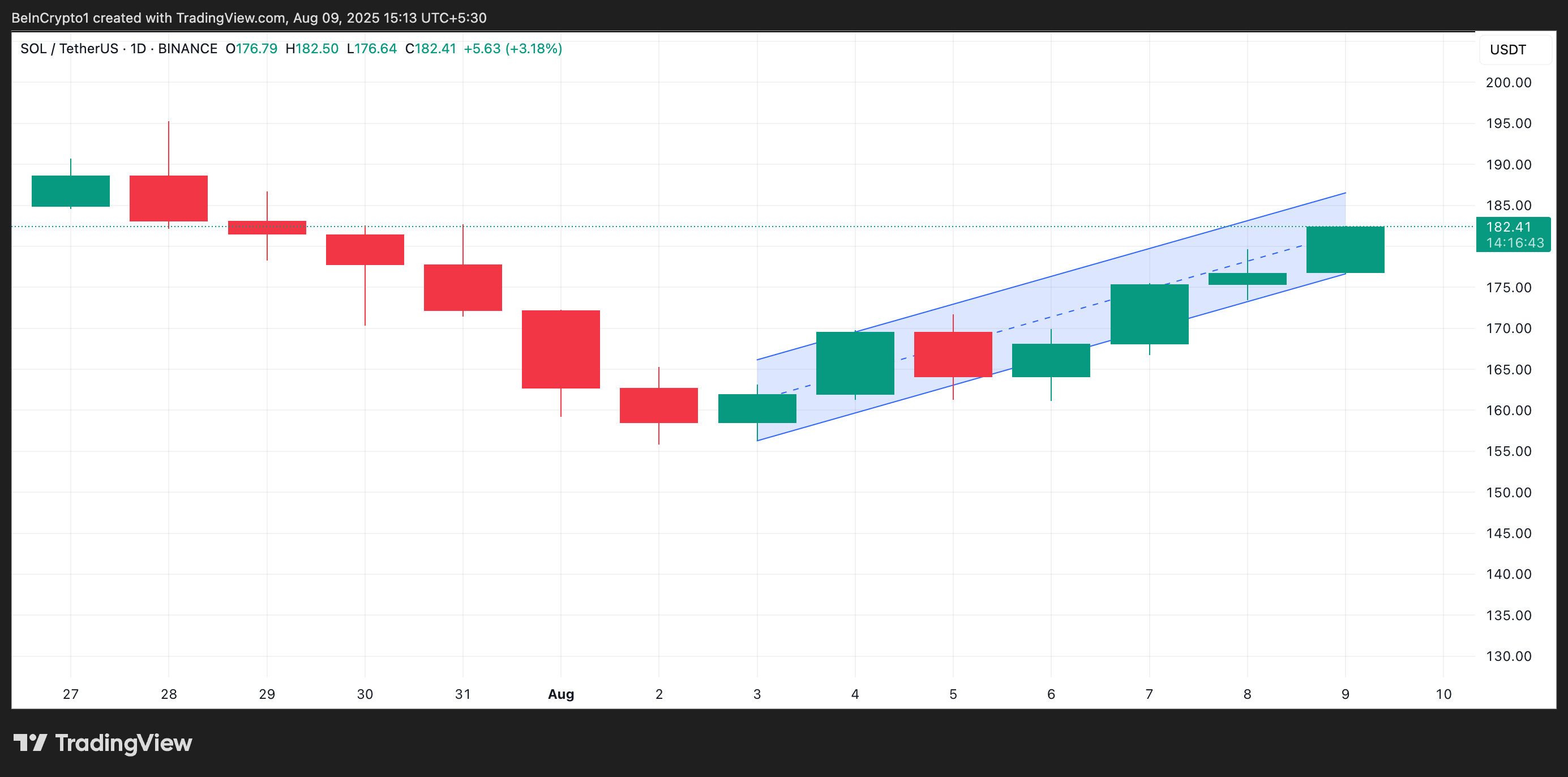 撰稿时SOL交易价格为181.82美元,正试探上升平行通道上轨186.52美元阻力位。若买盘动能增强,代币可能突破该阻力并冲击190美元心理关口