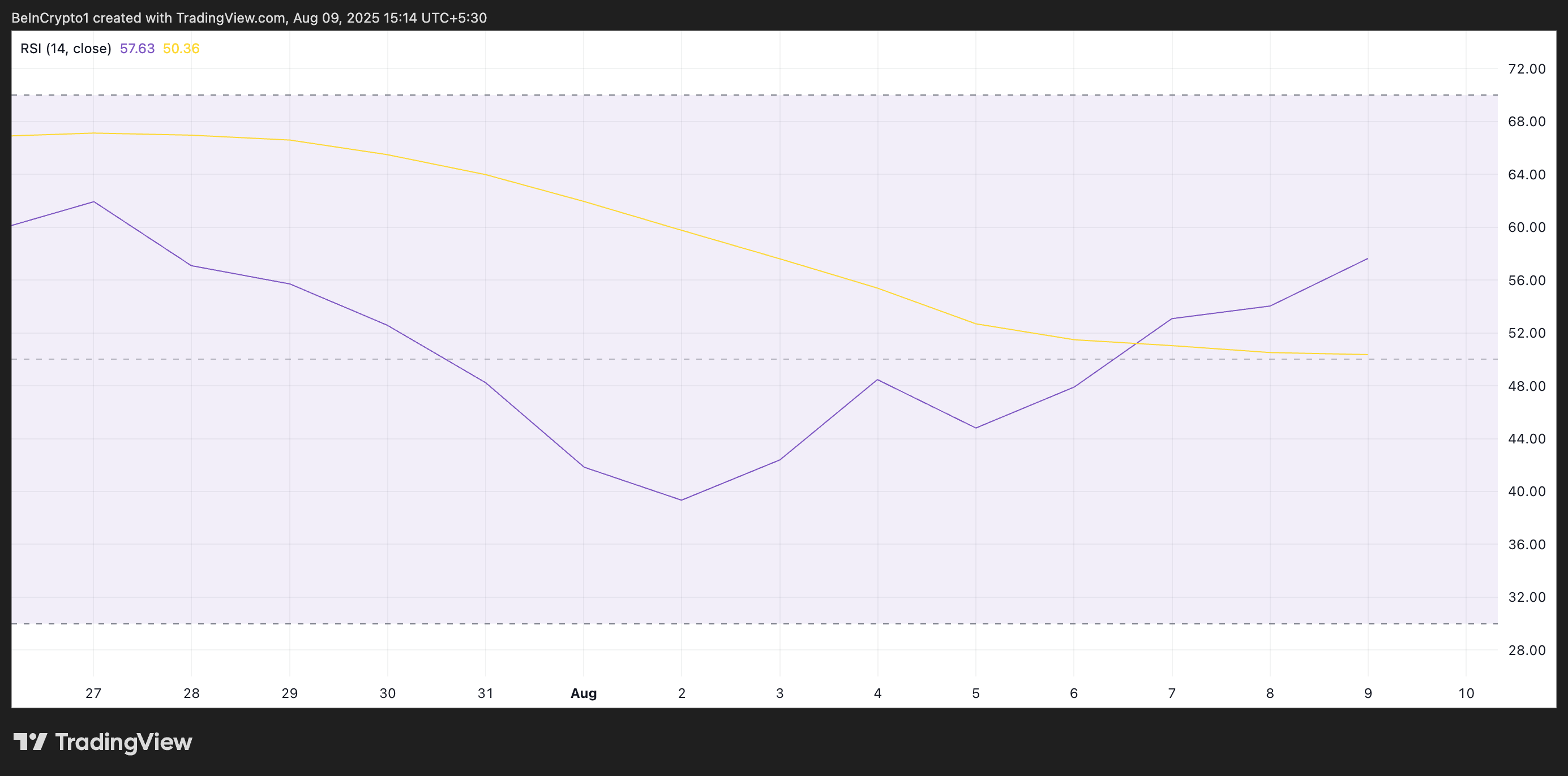 当资产在此类通道内交易时,表明市场处于需求压倒供给的上升趋势。SOL的相对强弱指数(RSI)读数印证了当前买盘对其涨势的支撑。截至撰稿时,该动量指标报57.63。
