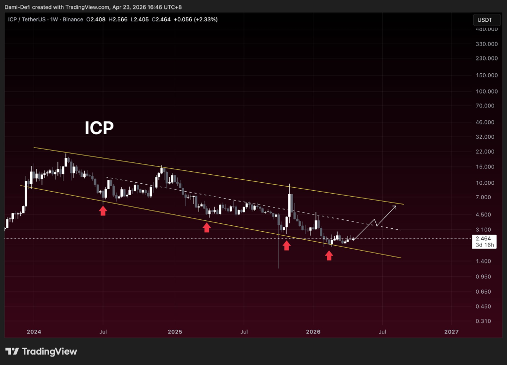 在周线图上经历了一段长时间的疲软后,互联网计算机正试图从关键区域反弹。ICP价格目前在2.46美元左右,接近一个多年下降通道的下边界。该通道自2024年中以来已多次起到支撑作用。