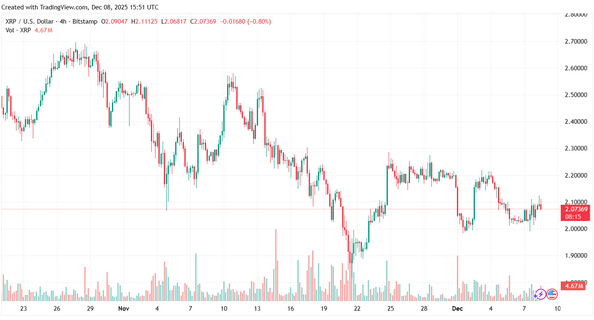 XRP的技术图表描绘出令人担忧的景象。该代币在2.00美元至2.22美元狭窄区间内震荡,每次反弹尝试均在阻力位失败。持仓量在100万至1000万XRP之间的钱包在过去一周抛售超过3.9亿枚代币,相当于7.83亿美元的抛售压力。图表显示XRP已从10月2.60美元附近的高点下跌20%。