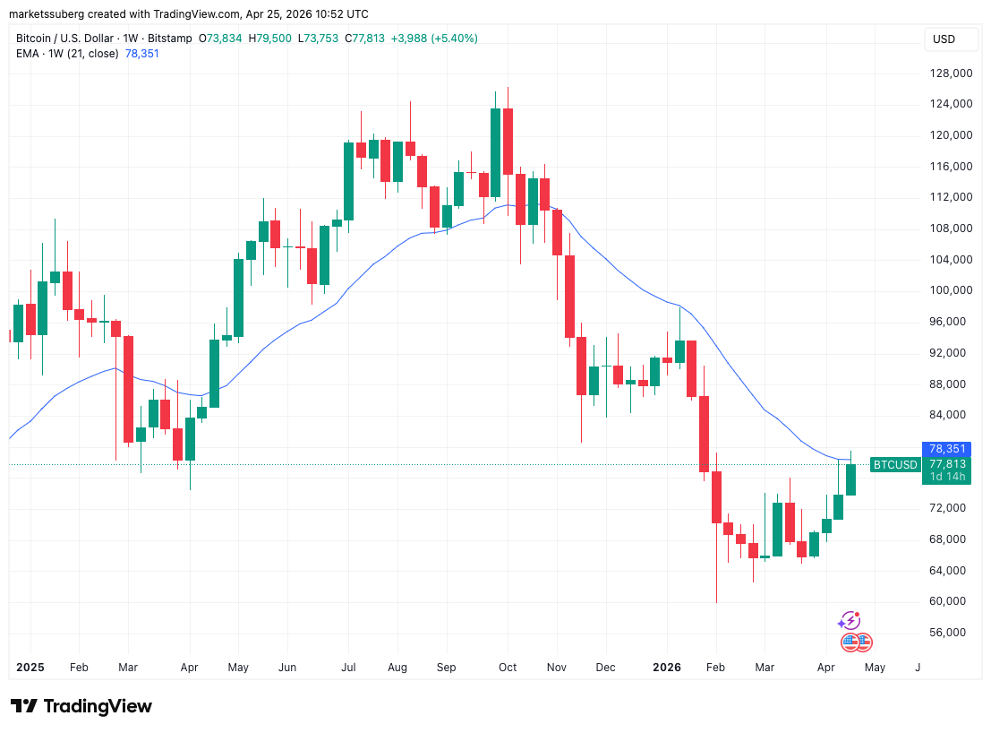 TradingView数据显示,比特币21周指数移动平均线(EMA)持续压制价格反弹。自2025年10月以来,BTC/USD始终在该均线下方运行,当前该均线位于78400美元。