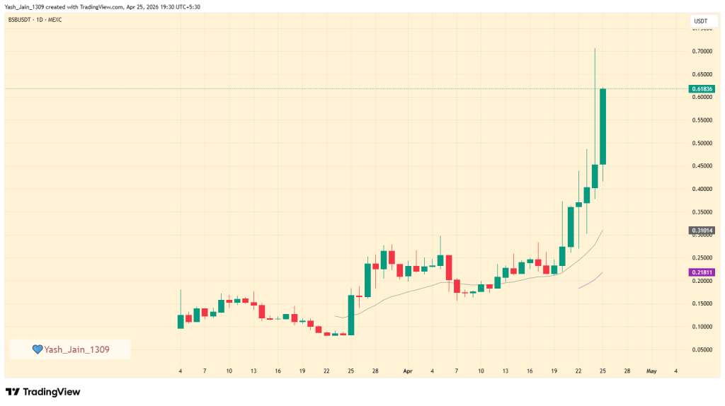BSB的价格本周不仅有所变动,更是出现了一次急速拉升,日内近60%的涨幅再次上演了令人瞩目的行情。我们观察到,在短短14天内其价格从0.156美元飙升至0.621美元,涨幅高达300%,这样的走势足以让最资深的观察者都为之侧目。而这并非偶然,其背后正酝酿着一个叙事——这一次,不只是炒作。