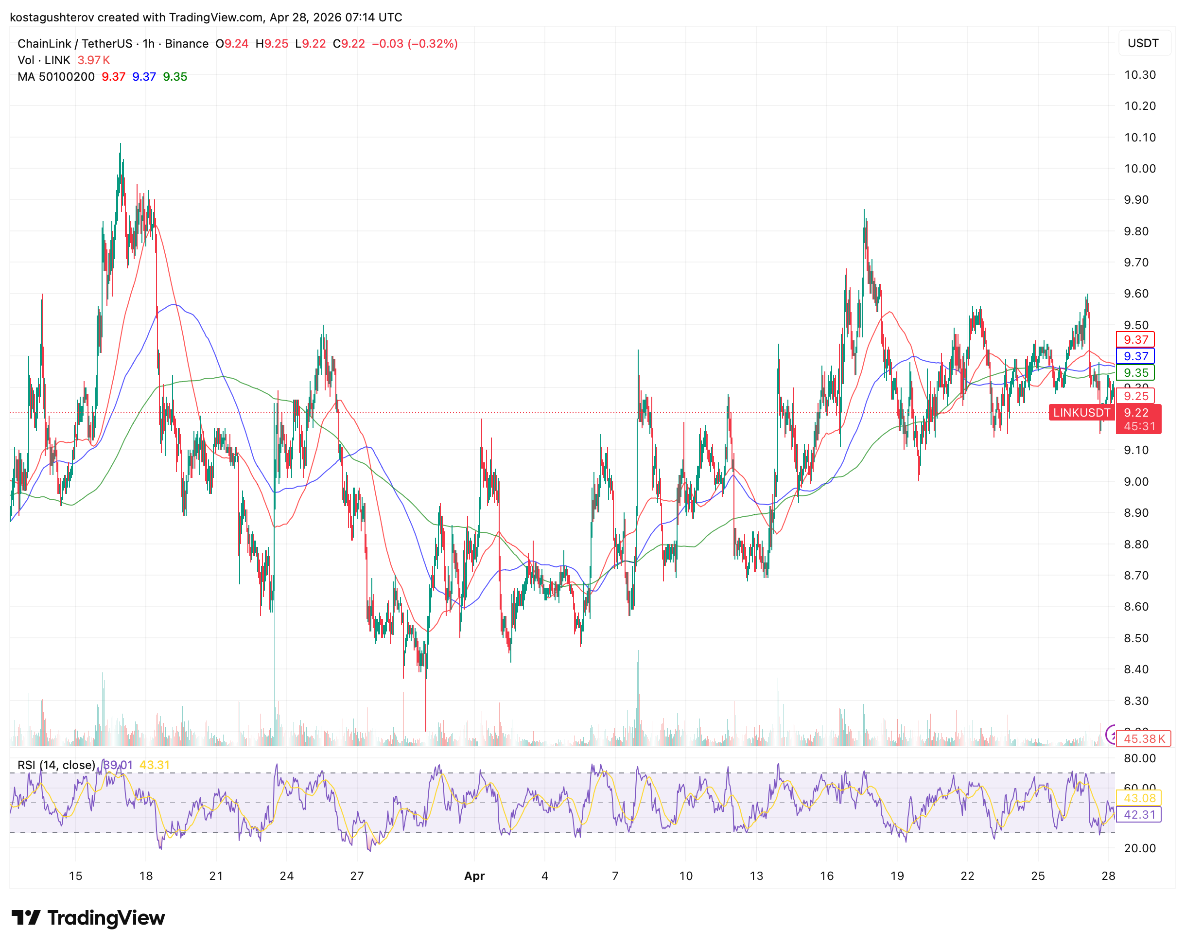 关键要点:自4月3日起,交易所储备从1.415亿枚降至1.309亿枚。4月25日净流出:970,430枚LINK(约合895万美元),为2026年以来最大单日流出。提现交易笔数为119笔,为30天内最低水平。交易所流入量为17.98万枚,接近整个观察窗口的最低点。供应比率自4月3日起从0.142下降至0.130。价格低于三条移动平均线(50日、100日和200日),均位于9.35至9.37美元区间。RSI(14)为42.31,接近但尚未进入超卖区间。