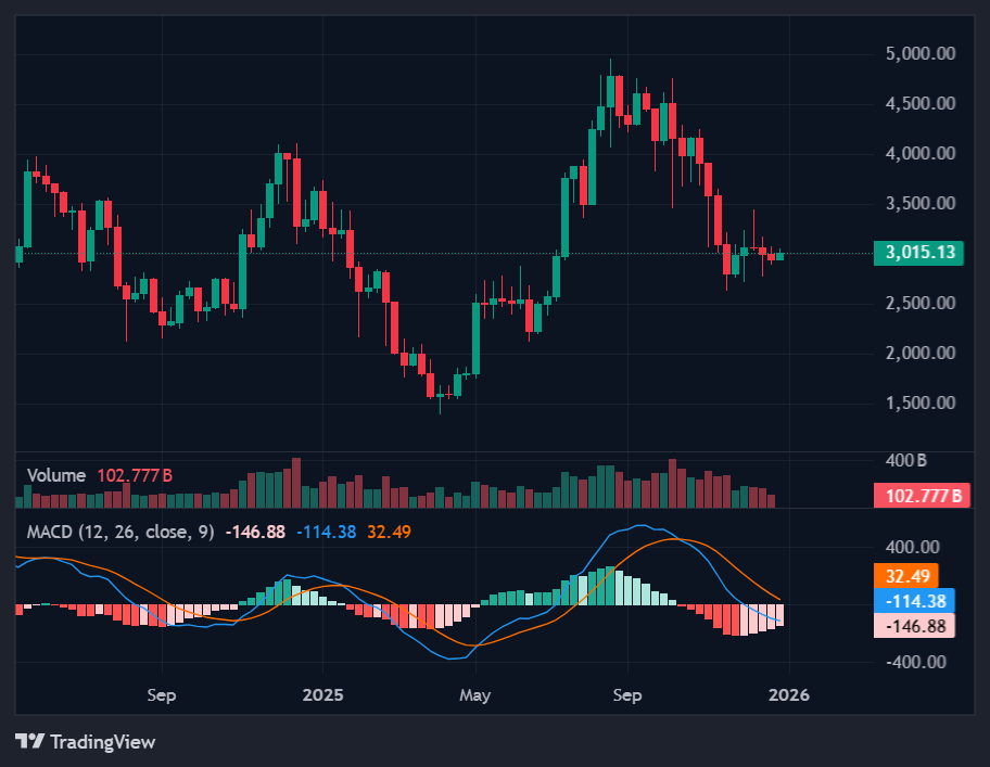 截至发稿时,以太坊价格徘徊在3,015.13美元附近,日内上涨2.75%,24小时交易量激增137.36%。但根据CoinMarketCap数据,ETH周线仍下跌0.77%。