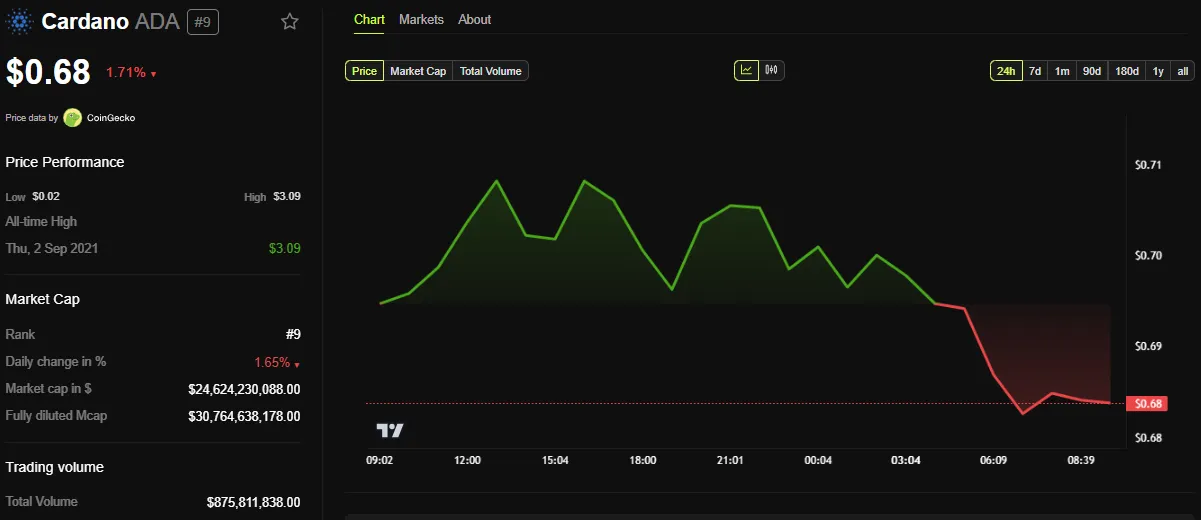 截至发稿时,Cardano的ADA代币交易价格为0.68美元,过去24小时下跌近2%。