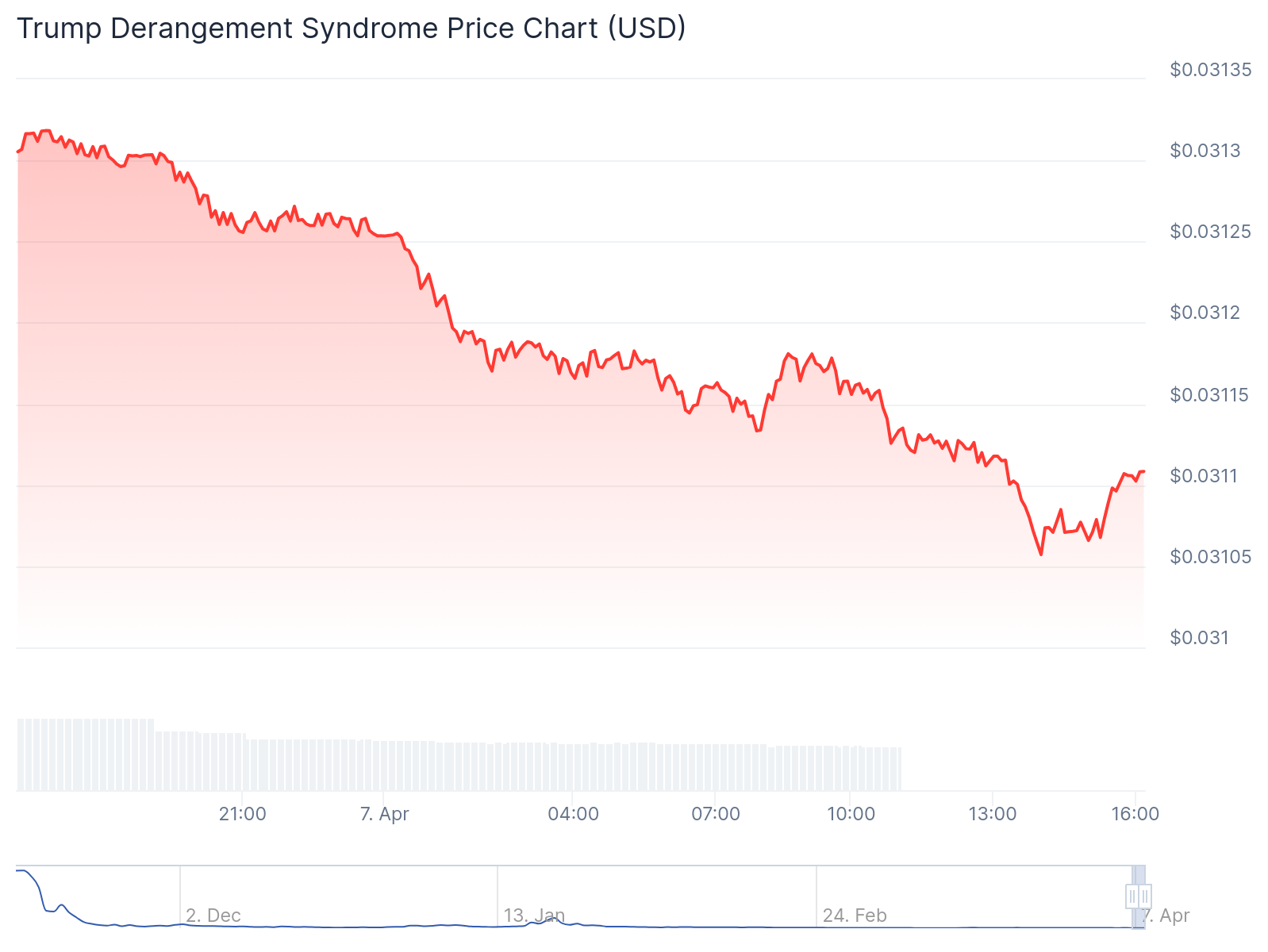 该代币以流行语“特朗普精神错乱综合症”命名,该术语被描述为“一种精神状况,据说个人因其对唐纳德·特朗普的强烈厌恶而做出非理性行为。”然而,自特朗普推出解放日关税以来,该代币进一步下跌。在过去一周,该代币下跌了30.5%。