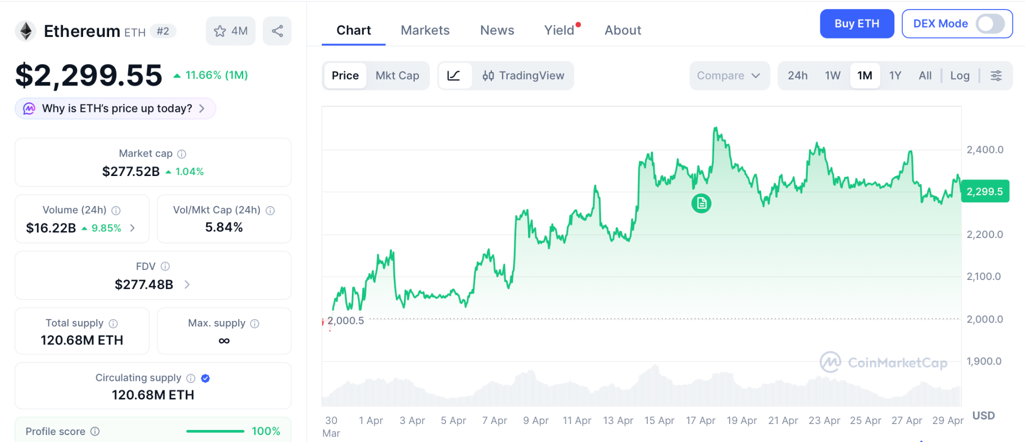 以太坊(ETH)价格现报2299美元,Glamsterdam升级目标6月削减78%燃料费