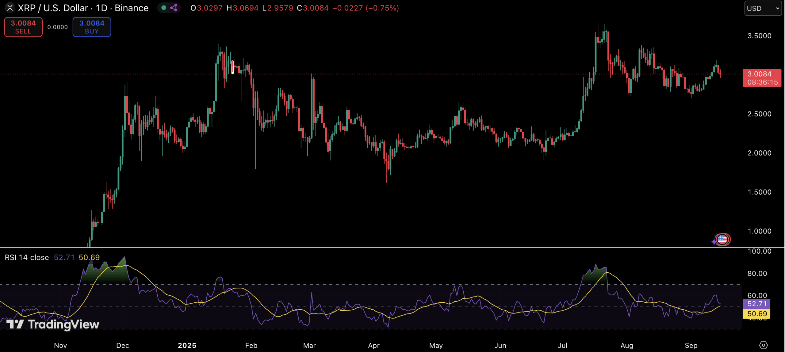 日线图上,XRP目前交易价格略高于3.00美元,相对强弱指数(RSI)维持在52附近,表明上周回调后市场动能呈中性。RSI既未显示超买也未出现超卖,意味着行情可能朝任一方向发展,具体取决于整体市场情绪。