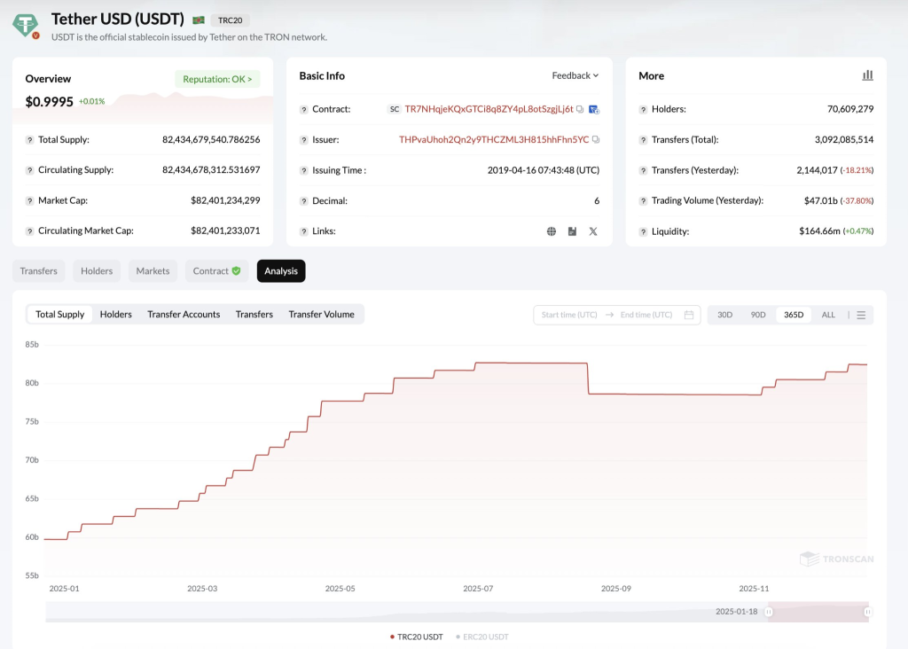 观察 Tether 的市场趋势,近期数据显示 USD₮ 的流通供应量稳步增长,目前已超过820亿 USDT。此外,Tether 持有者数量持续增加,已超过7000万,表明对稳定币的信任日益增强。