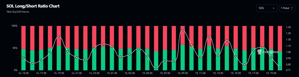当前市场动能偏空,卖方正主导价格趋势。多空比率已显著跌破1的均衡线,目前报0.7569,显示交易者正逐渐转向空头仓位。