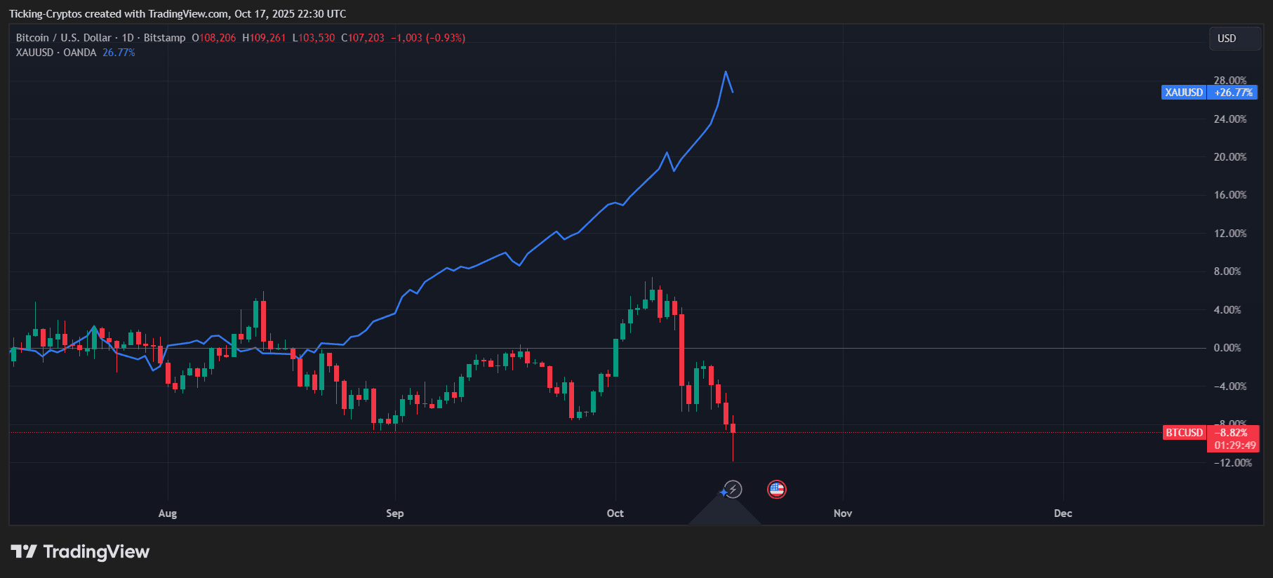 十月的市场走势呈现戏剧性对比:$Bitcoin在过去一个月下跌近9%,正危险地徘徊在10万美元心理关口附近;而$Gold同期飙升约15%,创下约4,300美元的历史新高。