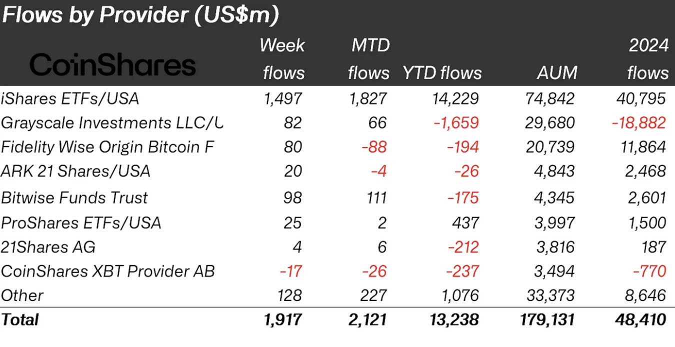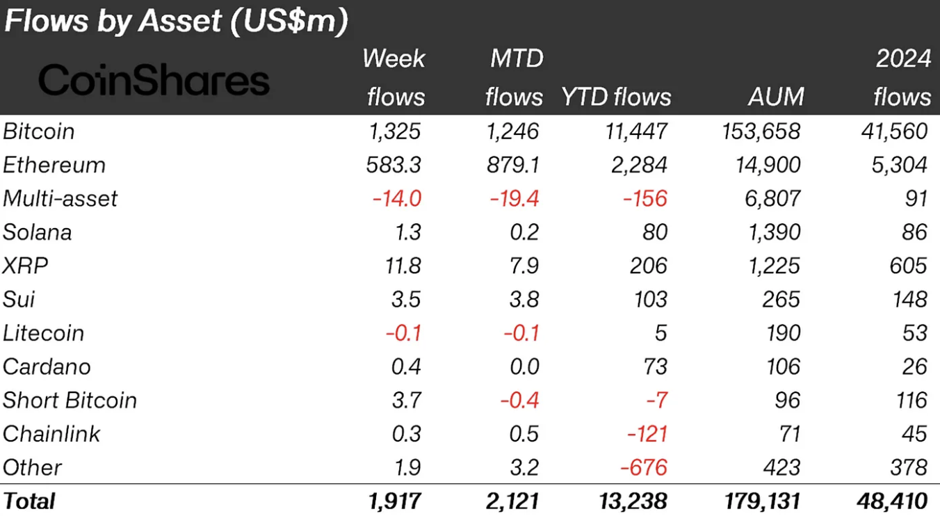 比特币在经历两周小幅亏损后强势反弹,单周吸纳13亿美元资金。虽然比特币空头产品获得370万美元流入,但其管理资产规模仍维持在较低水平的9600万美元。