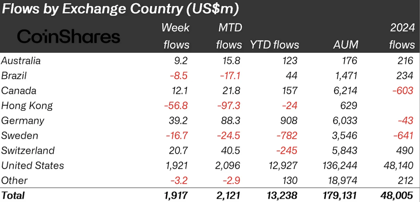 根据Coinshares数据显示,主要市场投资者情绪整体保持乐观。美国以19亿美元流入位居榜首,德国以3920万美元紧随其后,瑞士增加2070万美元,加拿大市场则录得1210万美元资金流入。与之形成对比的是,香港出现5680万美元资金外流,巴西市场则流失850万美元。