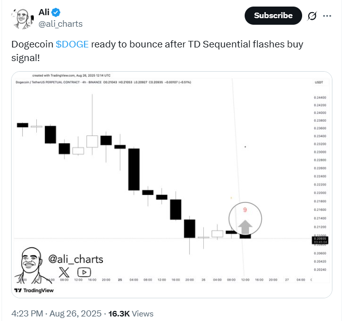 截至发稿,狗狗币(DOGE)交易于0.2189美元,略高于多空分水岭0.20美元。2025年8月26日,当TD序列指标出现买入信号后,这款迷因币初现复苏迹象。分析师Ali Martinez在X平台指出,该信号出现在4小时图连续九根阴烛之后。
