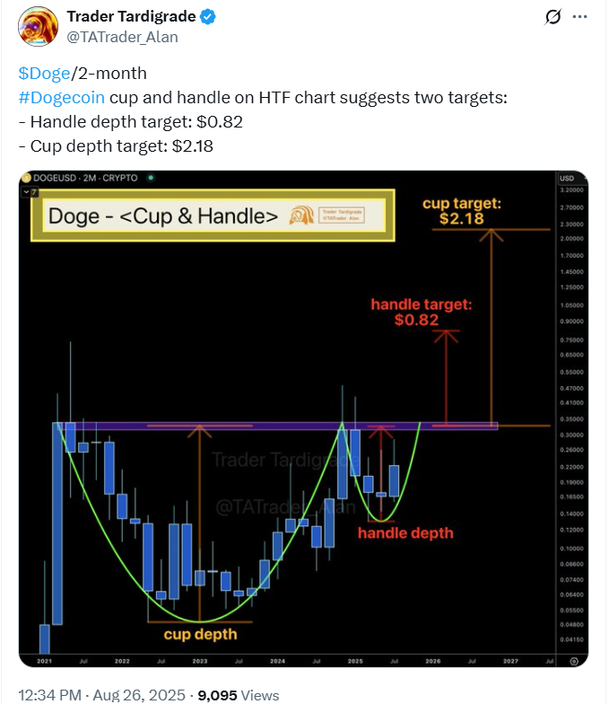 交易员Tardigrade通过研究更长期图表补充道:两个月形成的杯柄形态通常预示上涨行情。根据其分析,柄部深度对应0.82美元目标位,完整杯形则指向2.18美元。另一位观察员Morecryptoonl强调,0.20美元区域仍是当前结构基石,若失守则意味着调整尚未结束。