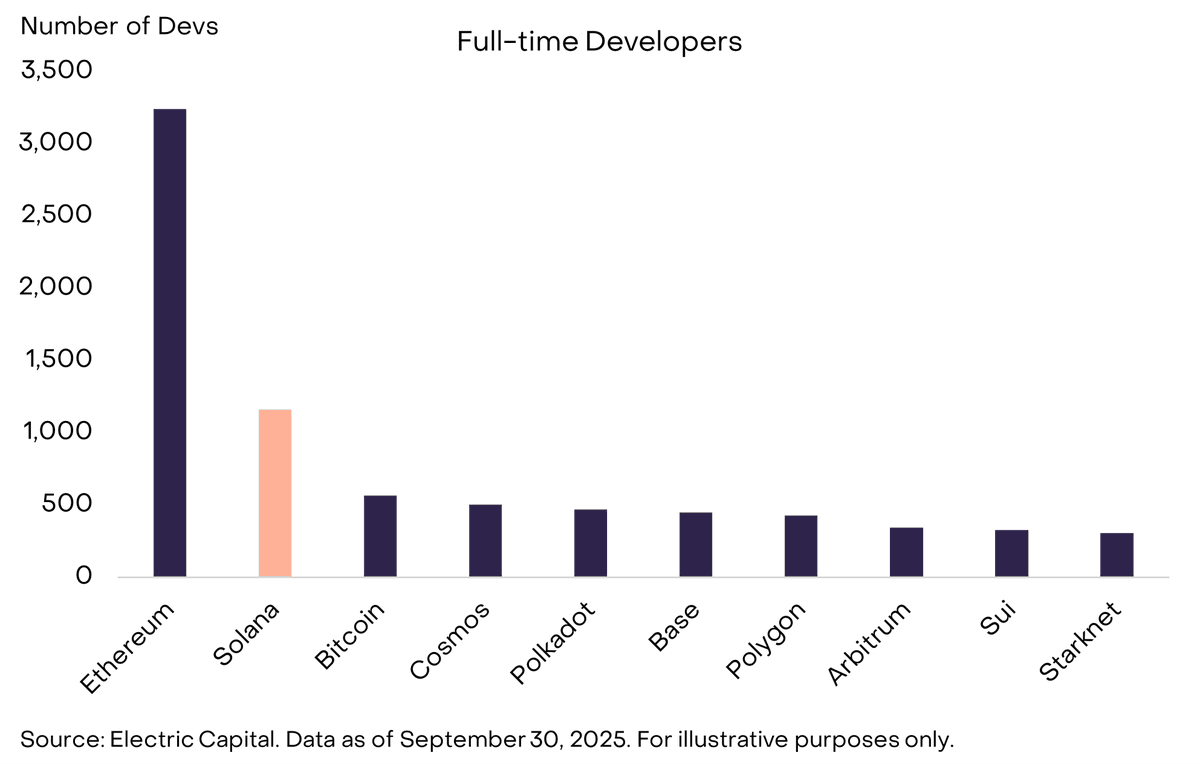 Electric Capital数据显示,Solana目前拥有超过1,000名全职开发者,仅次于约3,500名开发者的以太坊。这使其稳居以太坊之外增长最快的生态系统,其针对性能和可扩展性优化的高吞吐量特性正不断增强吸引力。