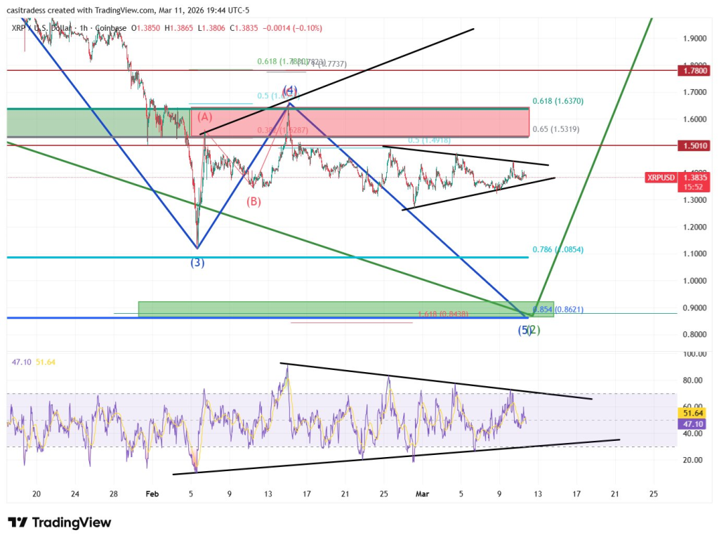 上行方向,阻力位位于1.65美元。该价位已压制数周,每次瑞波币试图突破时都遭遇卖盘。图表中该水平犹如坚固的天花板,若能有效突破,则意味着第四浪终结、第五浪启动。