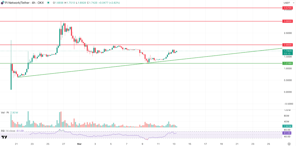 最新的价格变动使PI成为市值约124亿美元的第11大加密货币,较近期低点回升了38%。技术分析显示,PI的价格在关键支撑位的支撑下呈现强劲上升趋势,而日交易量已飙升至9.6亿美元,增幅高达131%。