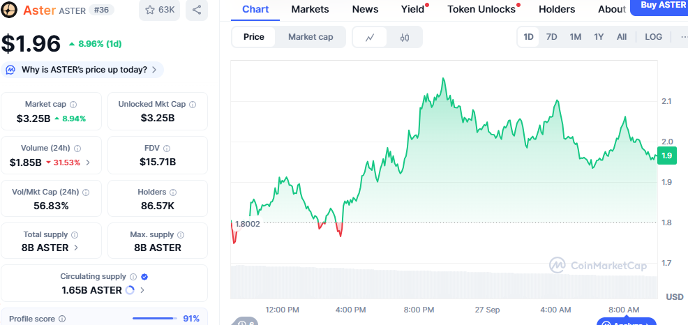 在1.80美元水平完成决定性反弹后,$ASTER重新站稳1.96美元。该代币在修正后形成更高的低点,买方重掌主导权。技术结构显示只要支撑位稳固,上行趋势将持续。