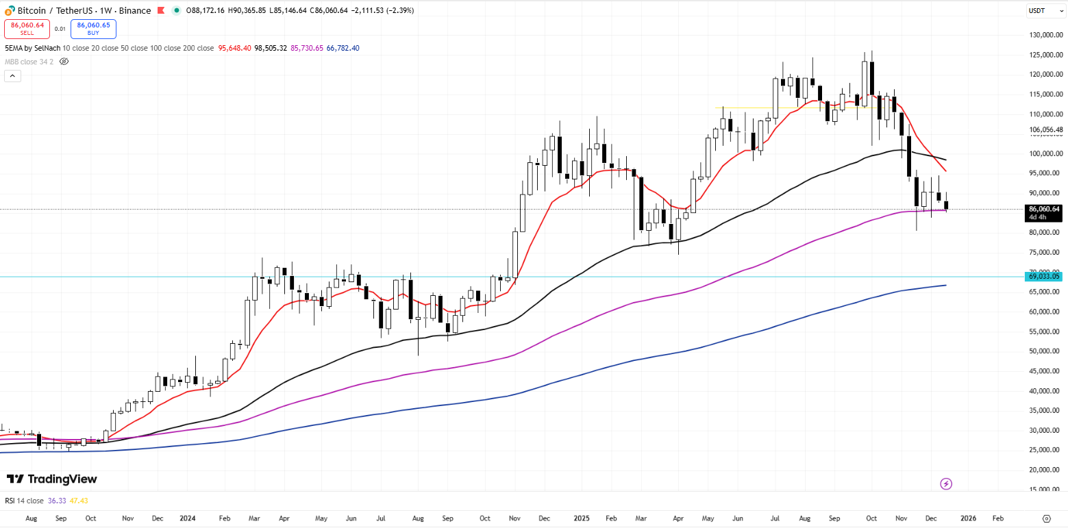 86000美元关口至关重要,因为BTC目前正处于100周移动平均线附近,若跌破此水平,在66000美元之前将毫无支撑。虽然BTC长期来看仍是当前最值得购买的加密货币之一,但此处的风险回报水平更有利于空头和看跌者。