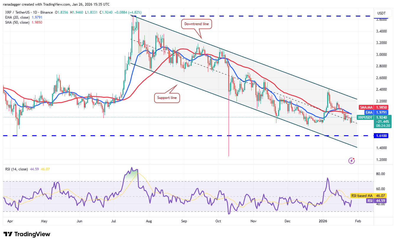 1.81美元处存在支撑,但技术性反弹可能在20日EMA(1.97美元)处遭遇抛售。如果价格从20日EMA急剧掉头向下,XRP/USDT交易对可能下探至1.61美元的坚实支撑位。