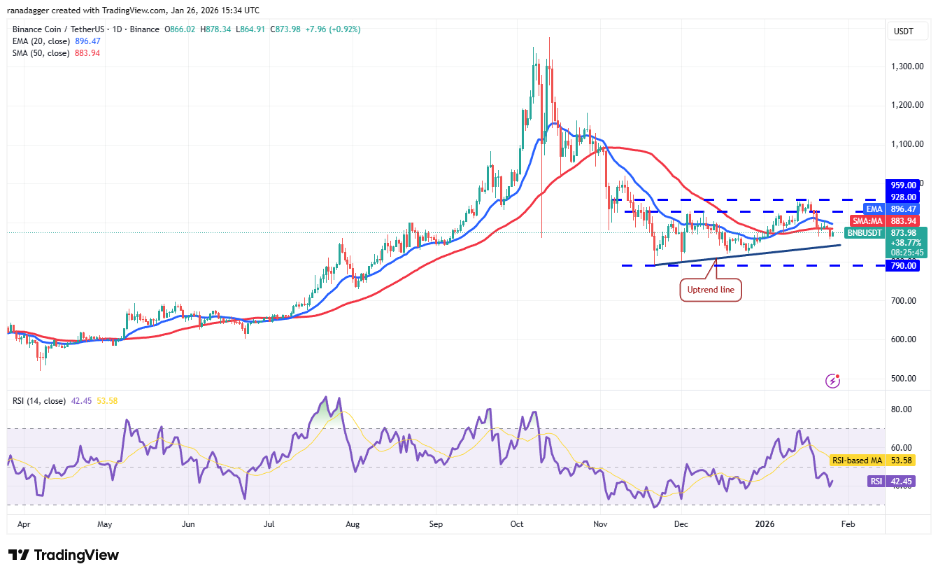 币安币(BNB)周日报收于50日SMA(883美元)下方,表明多头正在失去控制力。
