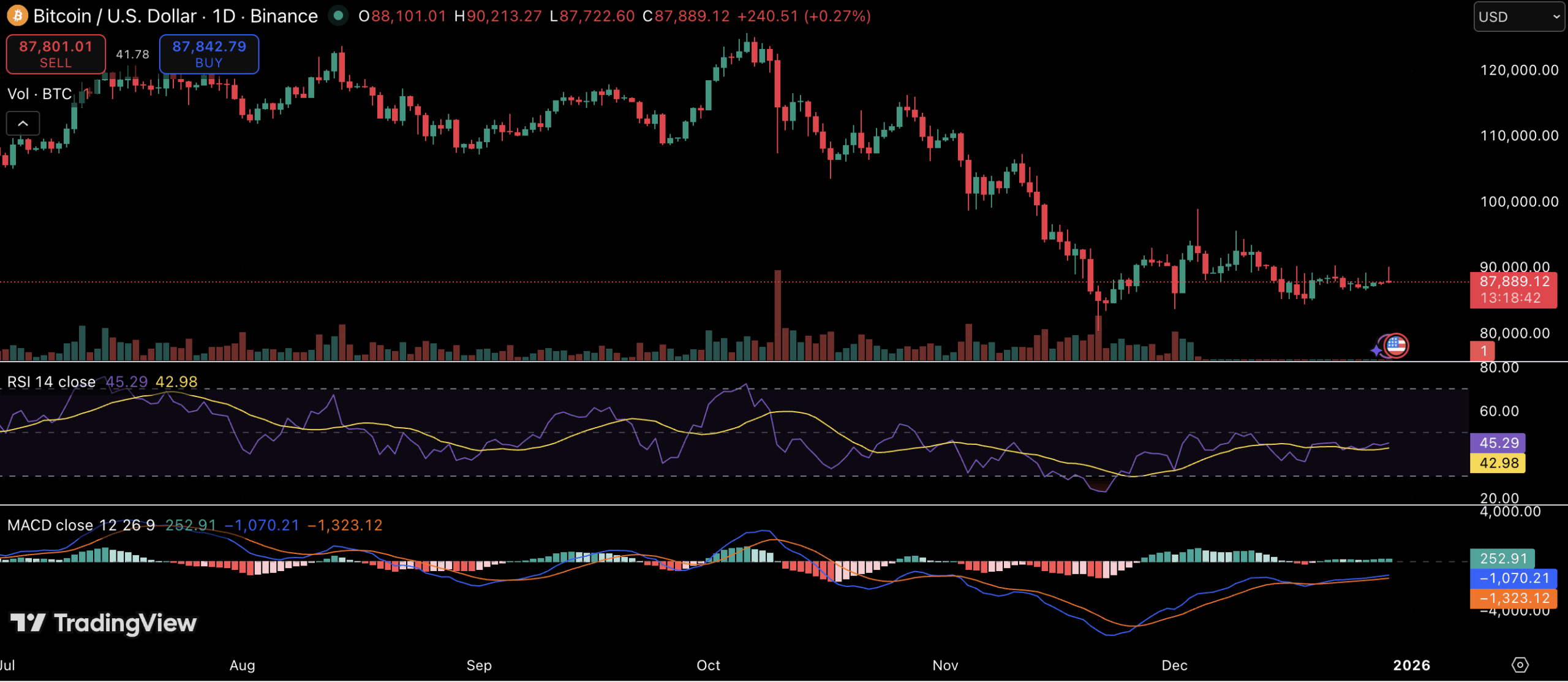 比特币在本交易日早间短暂突破90,000美元后回落,截至撰稿时交易于88,000美元附近。日线图显示价格从周期高点125,000美元展开深度回调,随后数周的横盘整理表明卖压消退但看涨动能尚未完全恢复。