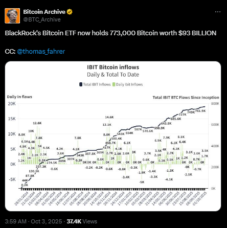 贝莱德比特币ETF持仓77.3万枚BTC(930亿美元)。 | 来源:Bitcoin Archive, X