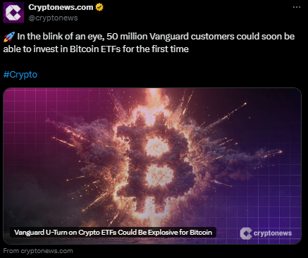 先锋集团5,000万客户或将获比特币ETF投资权限。 | 来源:Cryptonews, X