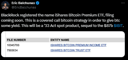 贝莱德申报iShares比特币溢价ETF——备兑认购型现货BTC基金。 | 来源:Eric Balchunas, X