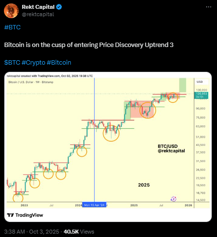 比特币逼近价格发现上行趋势3.0阶段。 | 来源:Rekt Capital, X