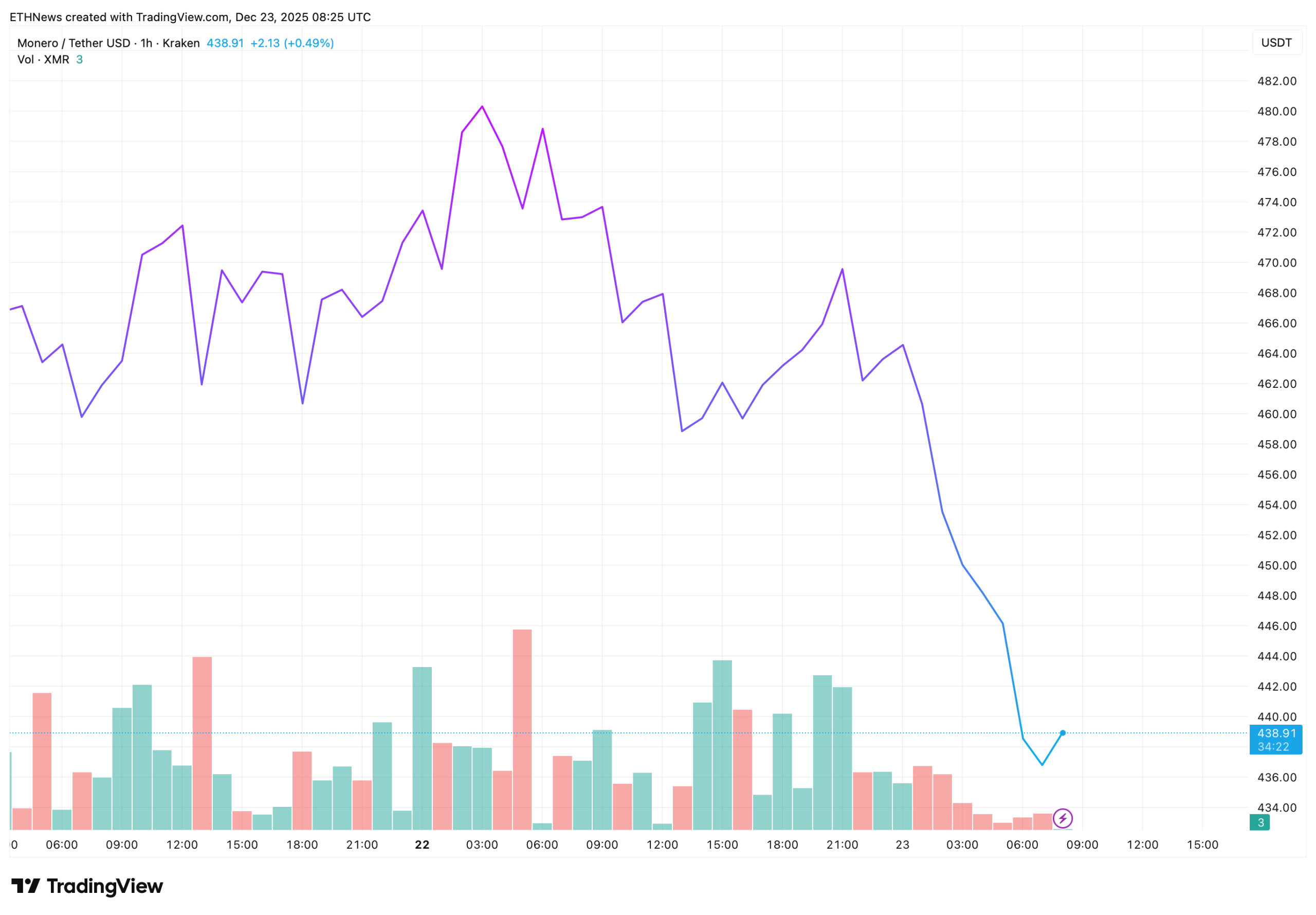 在日内一轮猛烈抛售将价格推回438-440美元区间后,门罗币(XMR)正面临新的下行压力。尽管移动平均线反映出看涨的长期结构,但短期动能已明显减弱,市场关注焦点转向多头能否稳住价格,抑或进一步下跌。