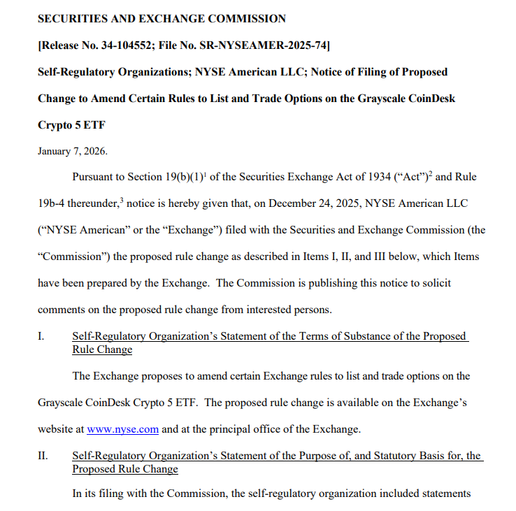 根据美国SEC最新公告,NYSE American提交了一项规则变更提案。该交易所寻求批准上市并交易灰度CoinDesk加密资产5 ETF(GDLC)的期权。