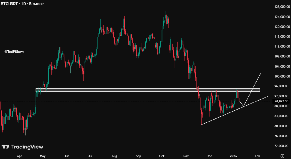 分析师Ted Pillows声称,他仍认为比特币在出现任何重大下跌趋势前,将触及98,000-100,000美元。