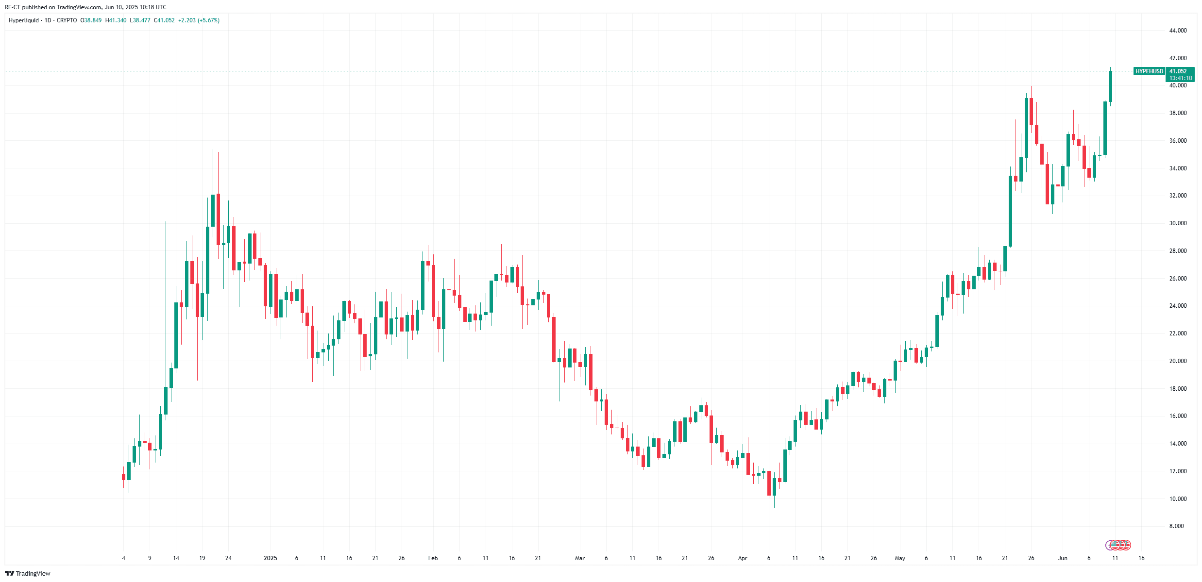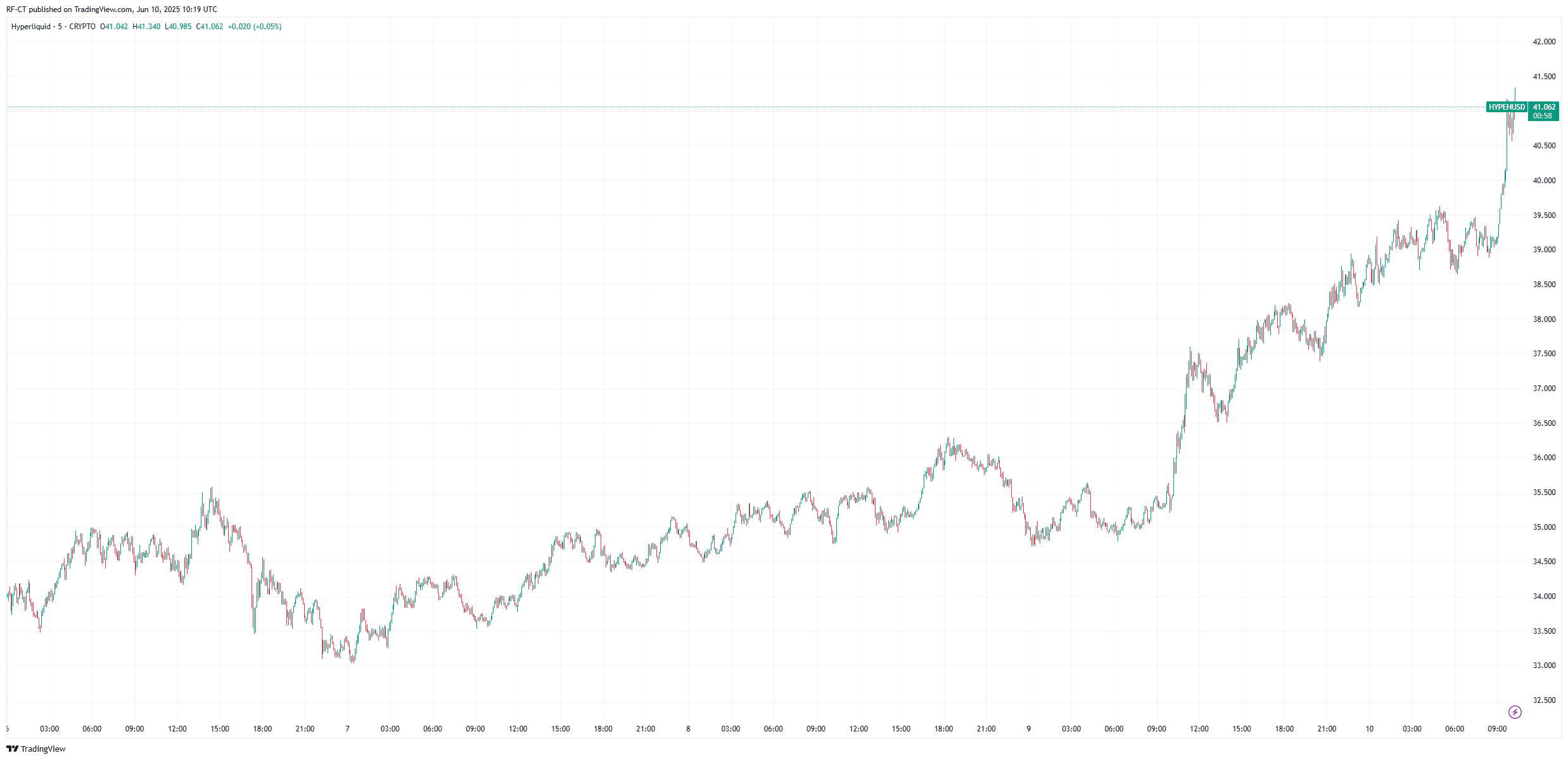 Hyperliquid(HYPE)当前交易价格约为40.86美元,盘中最高触及40.99美元。这一暴涨创下历史新高(ATH),市场投机情绪高涨且机构兴趣持续攀升。过去24小时内HYPE涨幅超12%,交易量突破4.3亿美元,使其成为加密货币投资者重点关注对象。