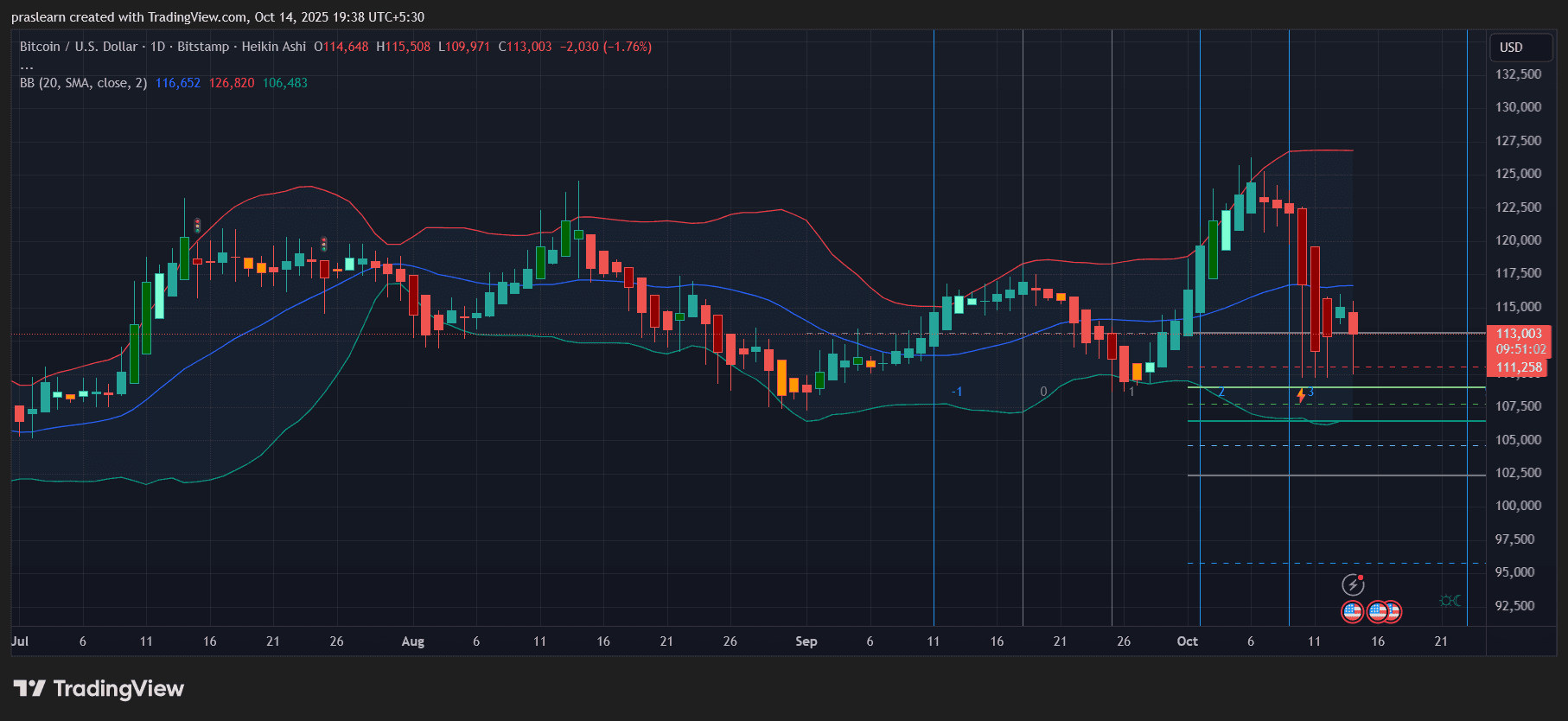 仔细观察日线平均K线图,比特币现徘徊于11.3万美元附近,受阻于20日均线116,652美元——该位置曾为强力支撑,如今转为阻力位。布林带持续扩张且向下倾斜,显示市场波动率居高不下,卖方仍占据主导。