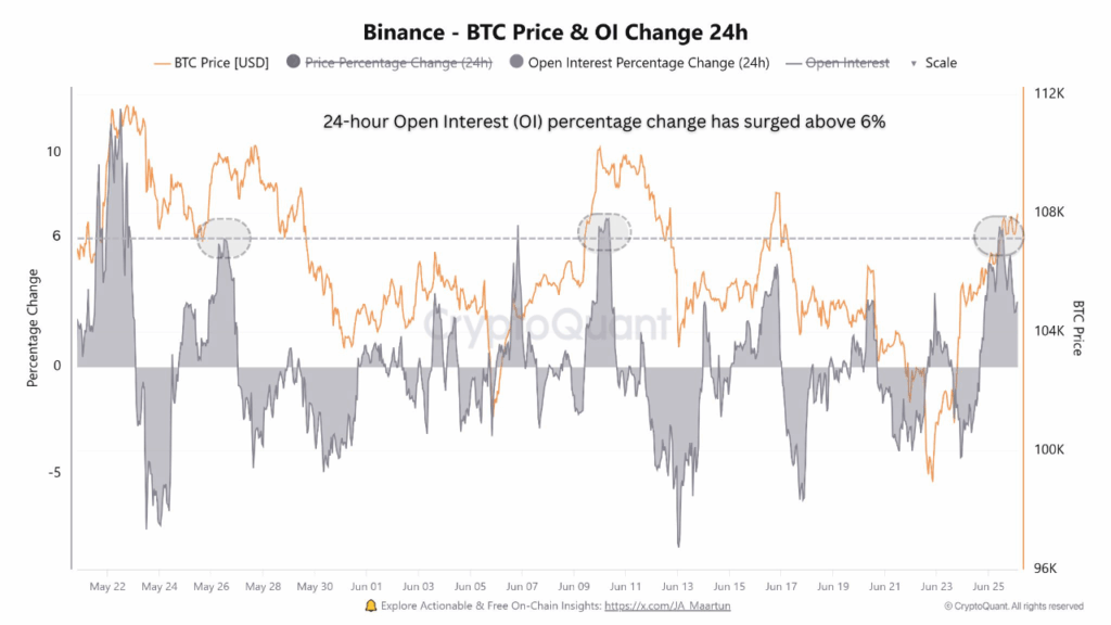 CryptoQuant链上分析显示,币安未平仓合约(OI)两个月内第三次触及6%水平。历史数据显示,该指标往往与获利了结区域重合。