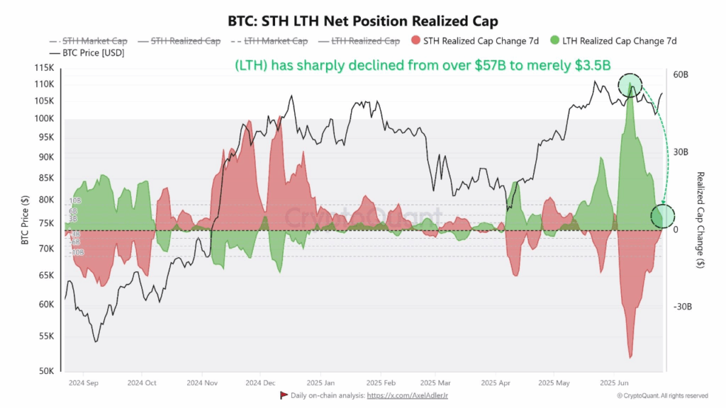 长期持有者净持仓实现市值指标显示,比特币长期投资者的持仓从超过570亿美元骤降至仅35亿美元,表明长期持有者正在获利了结。