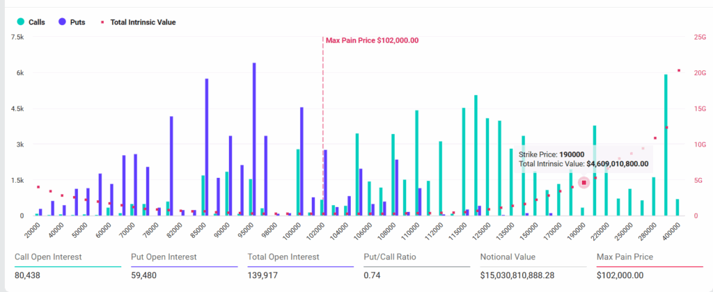 Deribit数据显示,超过13.9万份名义价值逾150亿美元的比特币期权合约将于周五到期,这是今年规模最大的期权到期日之一。
