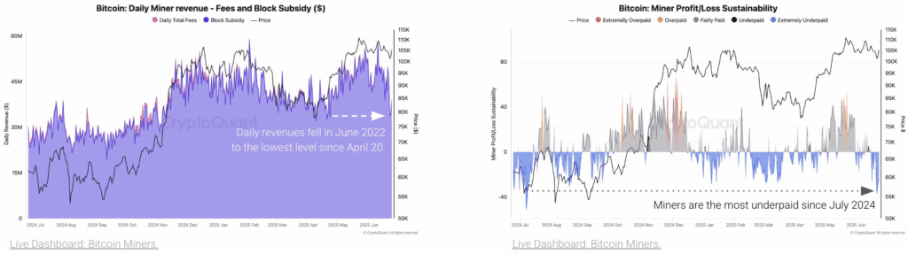 CryptoQuant 6月26日研究显示,比特币矿工正经历一年来最糟糕的收益期。6月日收入降至3400万美元,为4月以来最低水平,手续费降低和比特币价格下跌正侵蚀矿工利润。