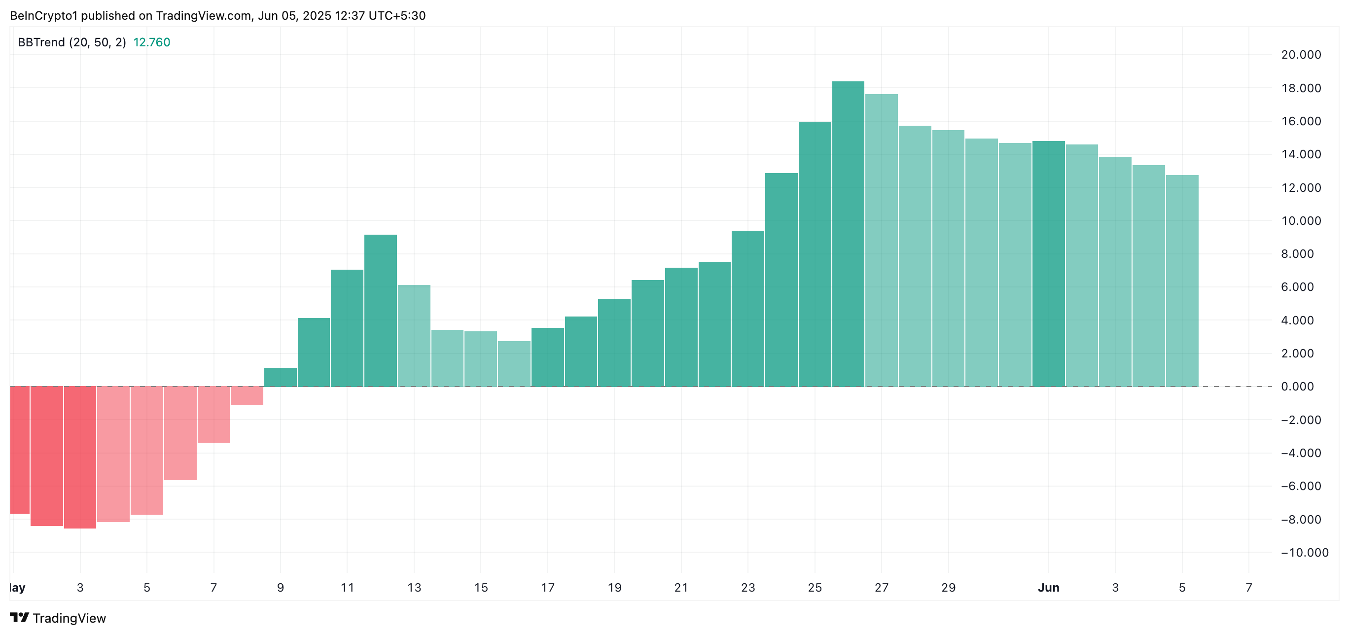 该山寨币的BBTrend指标读数进一步强化了乐观前景。在日线图上,该指标当前位于12.76,且自5月9日以来持续呈现绿色柱状图。BBTrend通过布林带的扩张与收缩来衡量趋势强度与方向:红色柱状图(负值)反映资产价格持续贴近布林带下轨,暗示持续抛压和潜在下跌风险;反之,正值通常预示强劲上升趋势。