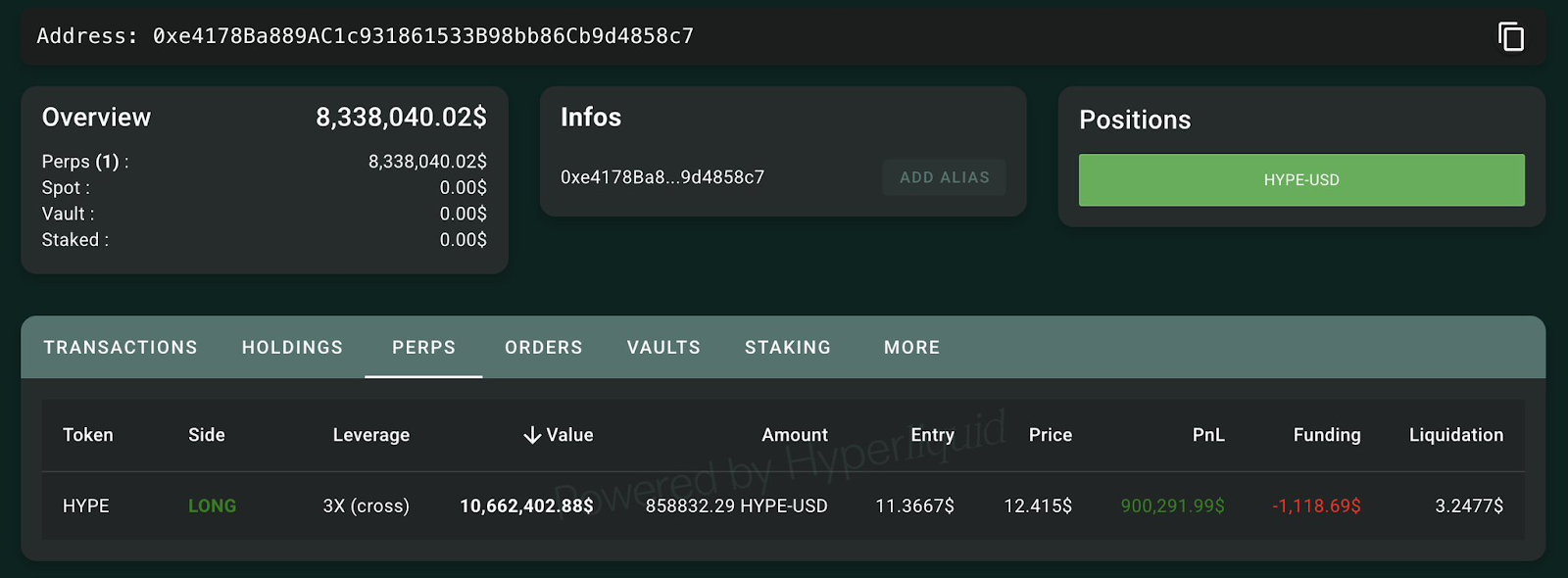 同样,Lookonchain显示一位交易者以约11.36美元的HYPE-USD交叉价进入了一个永续多头交易,清算(止损)价约为3.2477美元。根据Coinglass的市场数据,过去24小时内,HYPE期货的总未平仓合约(OI)激增了超过16%,在纽约交易时段早期周二徘徊在约4.45亿美元。