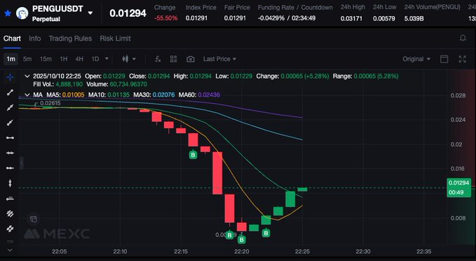 市场分析师VincΞnt.eth(@vincent_pp4806)指出PENGU/USDT永续合约图表生动展现了日内波动机制。一分钟图表显示先是出现陡峭的清算瀑布,随后空头回补引发急速反弹,这种模式象征流动性短期重置。