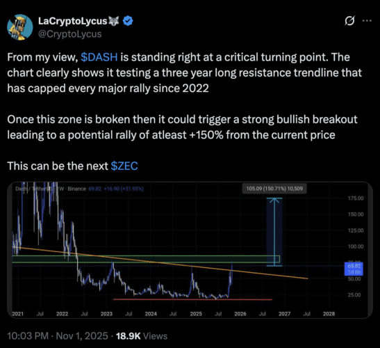 达世币是隐私币中的佼佼者,当前正在挑战三年阻力趋势线。分析师CryptoLycus指出,有效突破(已发生)可能推动价格升至175美元,使达世币在监管收紧的市场中成为追求自由的避风港。