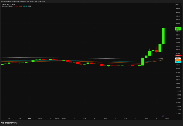 如果说达世币是隐私赛道的回归,那么Filecoin则是基础设施的复兴。当比特币颤抖、交易者恐慌时,FIL却逆向而行,周内价格飙升133%,这个去中心化存储领域的沉睡巨人终于苏醒。
