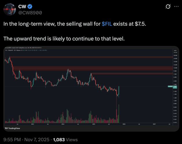 Artemis数据显示,文件存储币本周表现超越隐私币。知名分析师CW预测FIL可能攀升至7.5美元的关键突破目标。