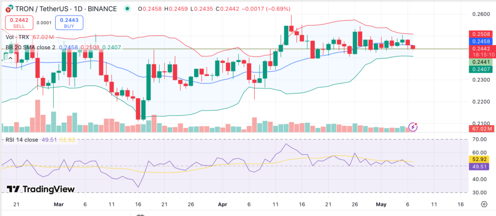尽管基本面表现强劲,但TRX价格仍面临压力。目前TRX交易价格约为0.243美元,在过去一天下跌6.2%后,难以突破0.25美元的阻力位。技术指标显示信号不一。