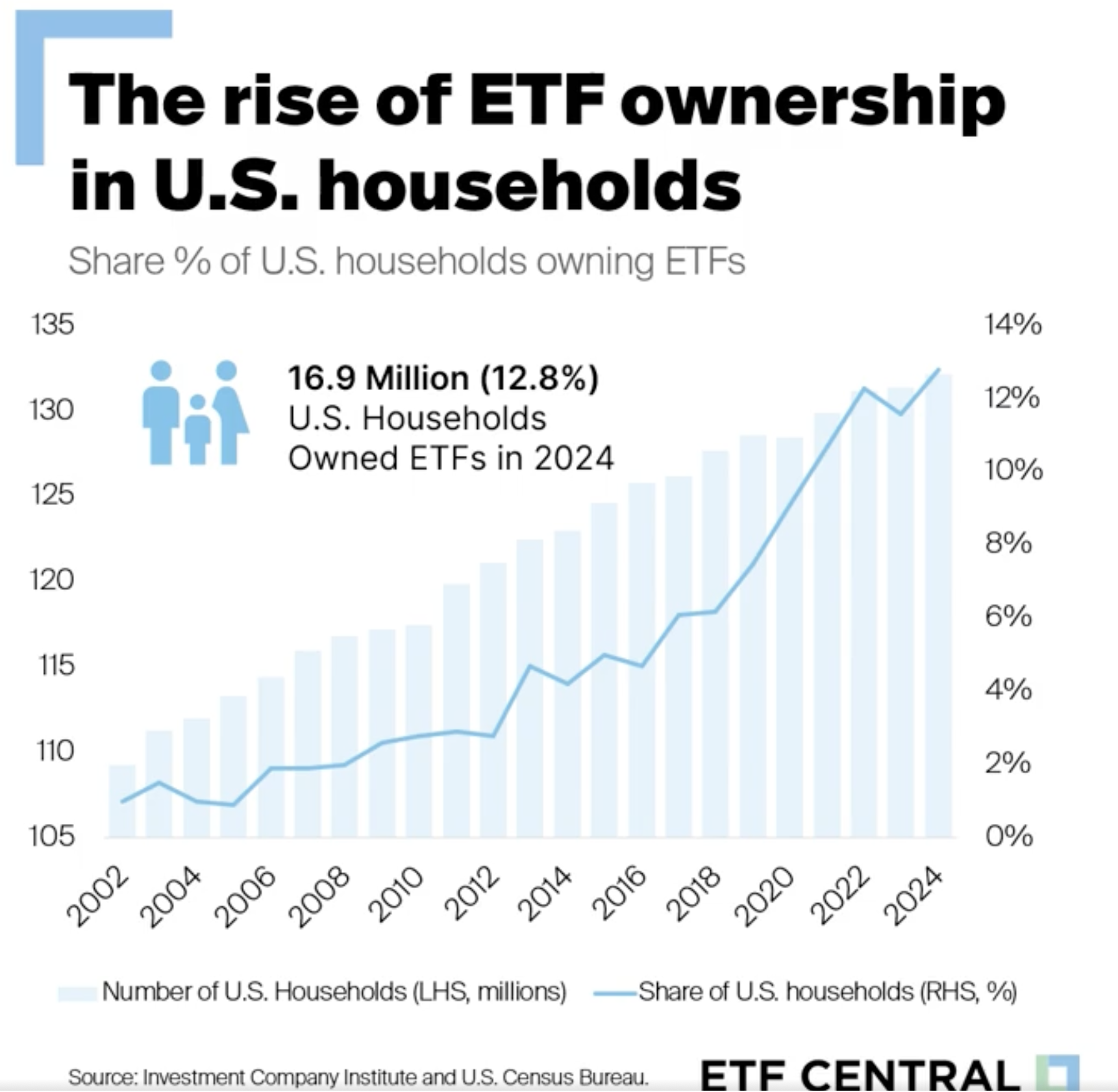 根据投资公司协会和美国人口普查局数据,截至2024年,美国已有1690万户家庭持有ETF头寸,家庭参与率达到创纪录的12.8%,凸显出这种低成本、多样化投资工具日益增长的吸引力。
