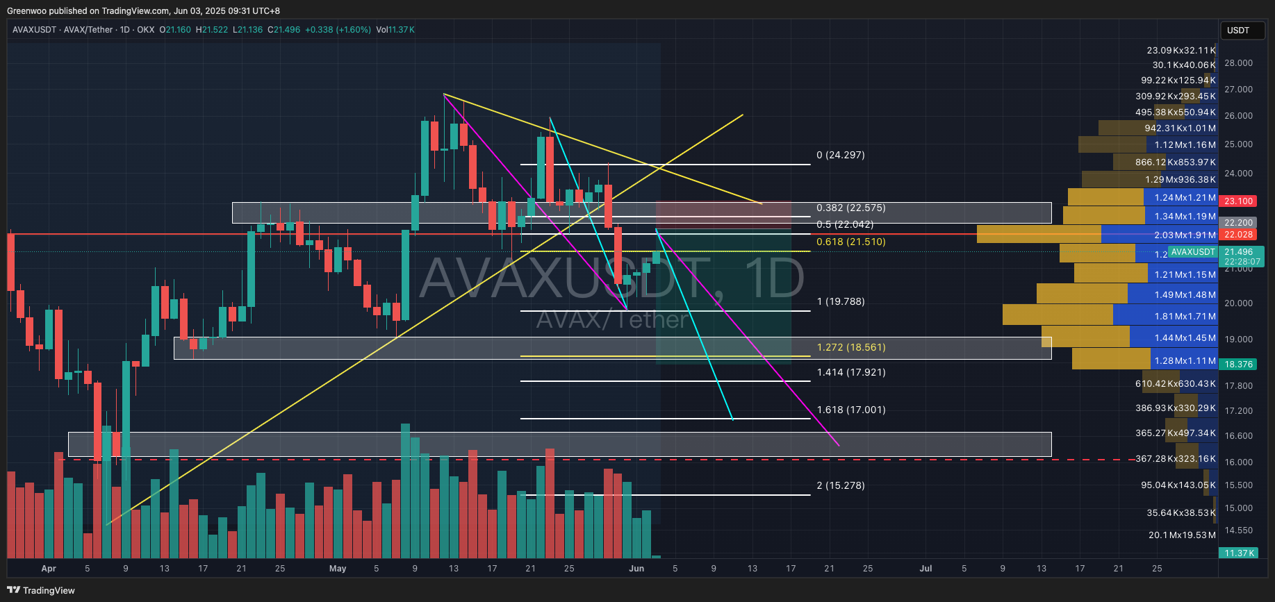 近期跌破下降趋势线后,在19.8美元附近获得支撑,撰稿时已反弹至21.5美元附近。该价位恰与斐波那契0.618回撤位重合。投资者可考虑在此建立空头仓位,或等待价格接近趋势线寻找更佳入场点。21.5-22.5美元区间提供了理想的进场机会,该区域对应斐波那契0.618至0.5回撤位,同时也是高成交量交易区。