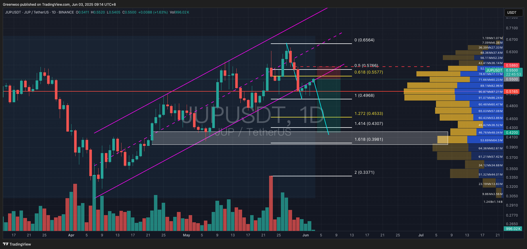 近日跌破下降通道后,在0.5美元附近获得支撑,撰稿时回升至0.55美元(斐波那契0.618位置附近)。当价格重新测试通道下轨时,可在0.55-0.575美元区间建立空头仓位。该区间横跨斐波那契0.618至0.5回撤位,并与高成交量交易区重合。